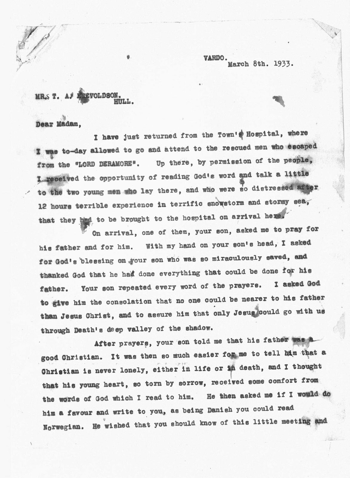 Following the sinking of the Lord Deramore, Thyge Andersen Enevoldsen's son Harold and the other surviving crew members were rescued by a Norwegian navy patrol boat. They had survived for 12 hours in a terrific snowstorm and stormy seas.